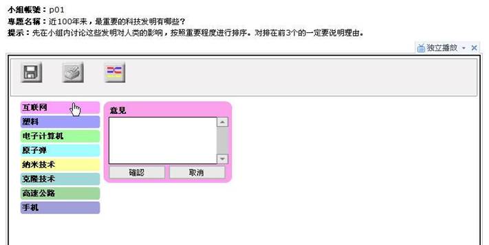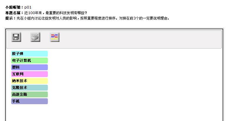在教师工作区建立了排序工具专题后,学生可以登录,开始使用工具。这一步,你将了解学生如何登入,使用专题工具。小组学友中,可以有一人担任教师的角色,其他学友都以某一个小组学生的身份登入学生工作区。在各人都建立了自己的专题的小组里,可由小组评选“最合适的专题”,让被评出的专题作者扮演教师角色,其他组员以学生身份工作。