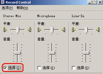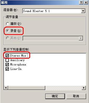 (1)打开系统音量控制界面,点击“选项>属性”,点选“录音”,在下面的“显示下列音量控制”选框中勾选“Stereo Mix”(立体声混合),点击“确定”。