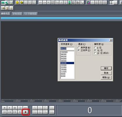 (3)打开Audition ,在单轨模式中点击“录音按钮”,在“新建波形”选项卡中设置参数为:
