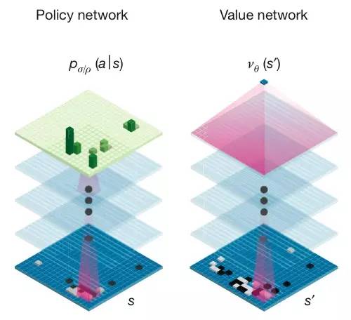 然后,科学家又给AlphaGo配了“两根神经”,一个是价值判断(value networks ),负责评估各个选点的价值,另一个是策略判断(policy networks),负责做决定,落子。