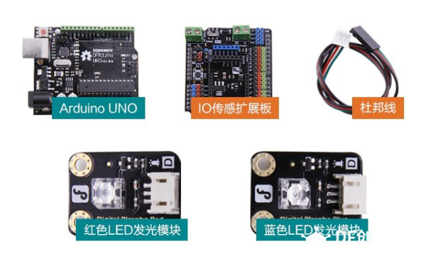 本节课使用的硬件:Arduino UNO、IO扩展板、 LED灯、杜邦线。