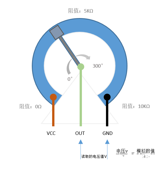 角度传感器旋转角度为0°~300°,对应返回电压值为0~5V,对应模拟信号数值为0~1023。