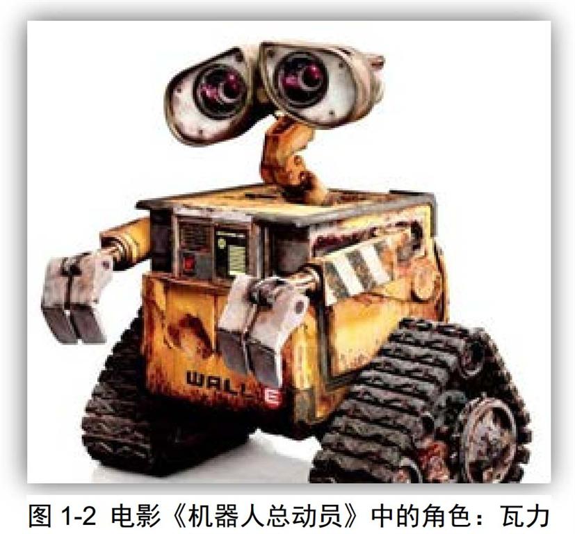 电影《机器人总动员》(参见:图 1-2)讲述了公元 2700 年,地球早就已经到了无法居住的地步,人类只能大举迁移到巨大的太空船上。在人类离开之后,留下了垃圾清理机器人瓦力,他的任务是垃圾分装。然而,一艘突然而至的宇宙飞船带来了专门搜索植物的机器人夏娃。瓦力追随着夏娃,展开了一次穿越整个银河系、令人兴奋、也极具想象力的奇幻之旅。