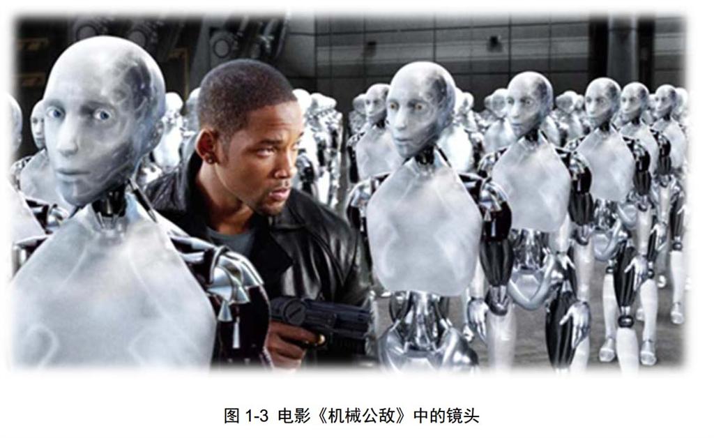 电影《机械公敌》(参见:图 1-3)讲的是在公元 2035 年,机器人已经是人们生活中不可或缺的物品和劳动替代品。在机器人三大定律的约束下,机器人得到了人类的信任并被委以重任。只有一位略显偏执的警察(威尔·史密斯饰)深信机器人就是一起案件的真凶。他独自展开调查,却发现整个人类都面临着来自机器人世界的灭种威胁。于是,警察开始只身一人唤醒世人的艰辛之旅。