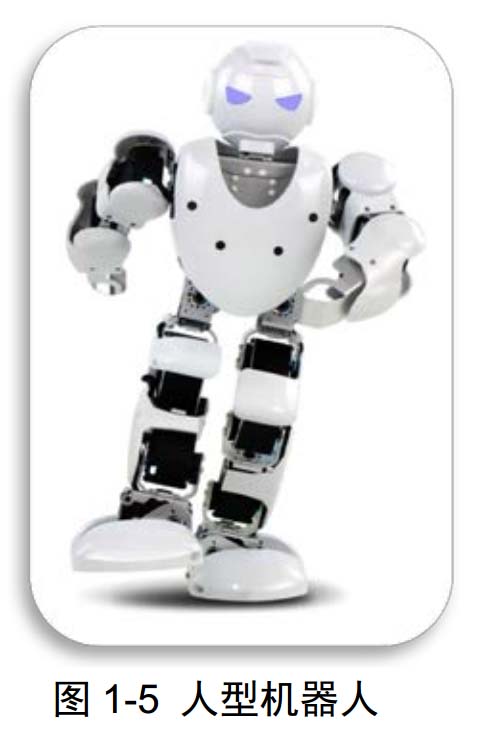 人型机器人(参见:图 1-5)。现在市场中有很多种人型机器人,它们像人一样有头、身、四肢。在本书的配套微课视频中有一段人型机器人跳舞的片段。 当然,机器人可能长得像人,也可能长得不像人,就像上面说到的扫地机器人,它长得像一个“厚盘子”。下面我们要介绍的机器人长得像是人的一部分,具体说,就是长得像“手臂”。