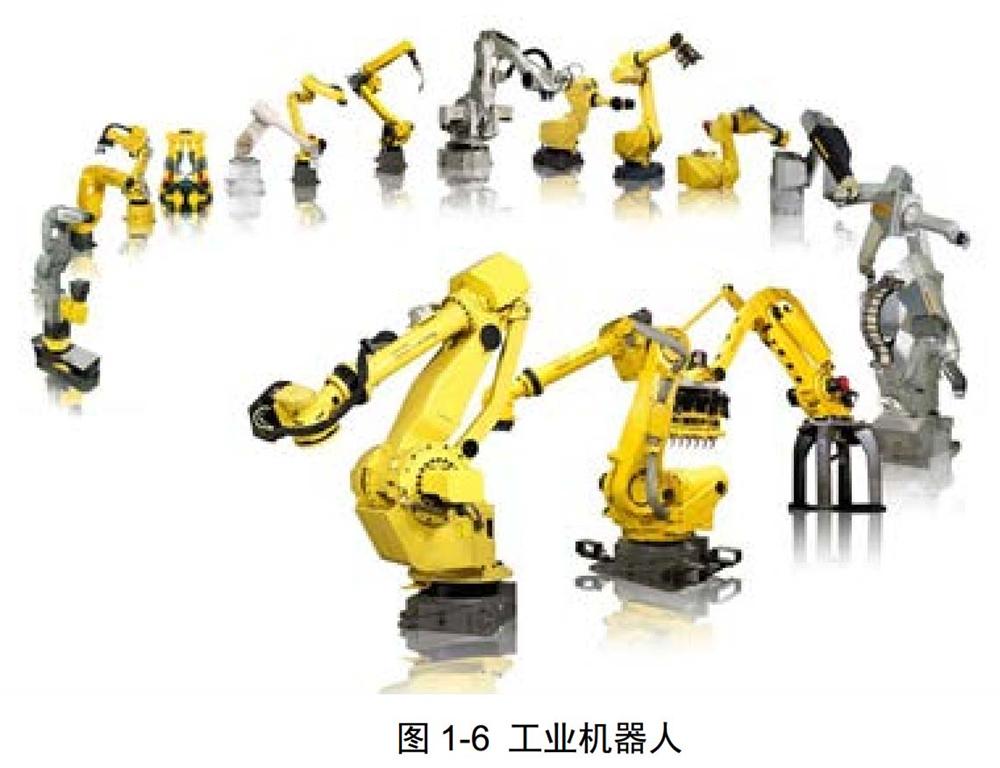 工业机器人(参见:图 1-6)。广泛应用于汽车、电子等工业制造领域,从外观上看就可以知道这种机器人是在模拟人类的手臂。在现代化的工厂里,工业机器人应用的越来越普及,大有替代熟练工人的趋势。或许有一天,在工厂里我们再也看不到忙碌的工人师傅,取而代之的是形态各异的工业机器人。