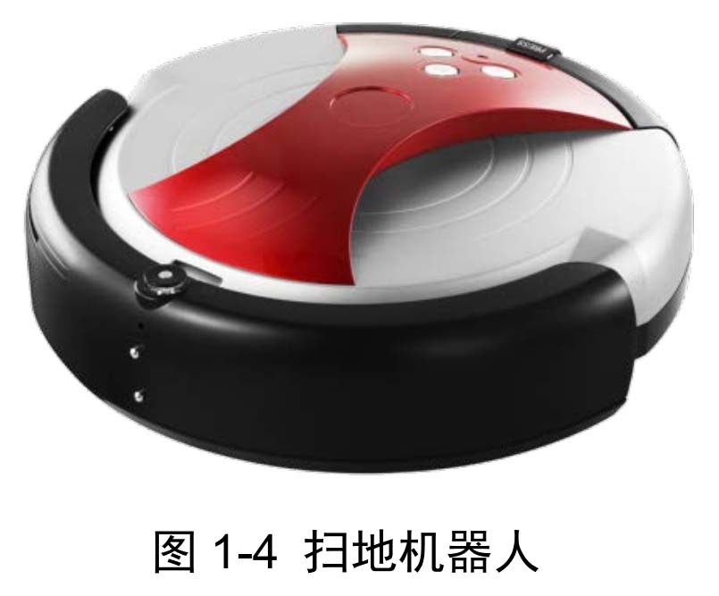 扫地机器人(参见:图 1-4)。这是一种已经开始进入家庭的机器人类型,有很多同学见过甚至使用过。这种机器人具有一定的人工智能,可以自动在房间内完成地板清洁工作。主要采用刷子和真空吸纳等方式,将地面上的垃圾装入自身的垃圾收纳容器中。