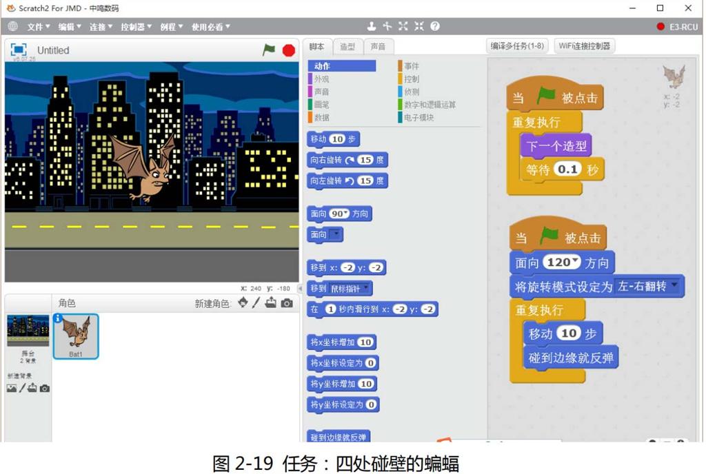 (二)参考“四处碰壁的蝙蝠”微课,完成“四处碰壁的蝙蝠”程序,保存到自己的电脑上面。