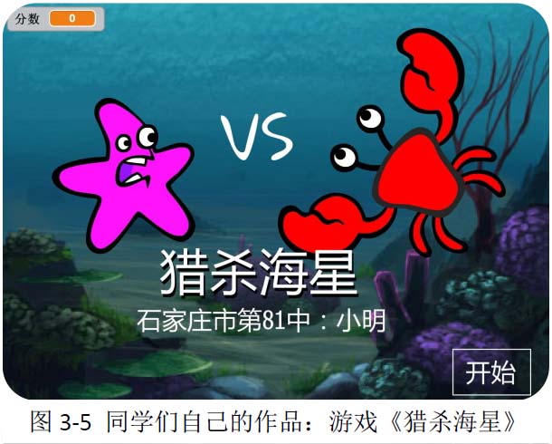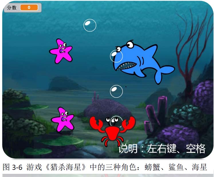 第三种角色,是你要“欺负”的角色(当然,如果你的水平不够,对方也可能欺负你),通过这种角色你可以得到各种类型的“分值”。在本章配套微课视频《第 3 课 大鱼吃小鱼》 中,我们提到了一部同学们自己制作的游戏《猎杀海星》(参见:图 3-5)