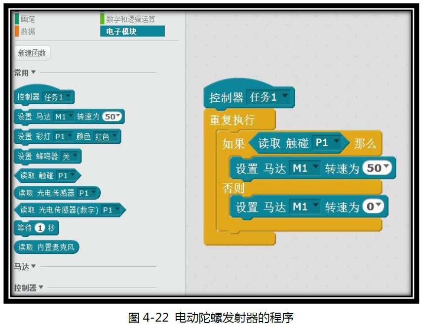 那么,这台发射器怎么用呢?按下“触碰传感器”,“电机”就会转,松开,就不再转了。说到这里,是不是程序也可以写出来了?