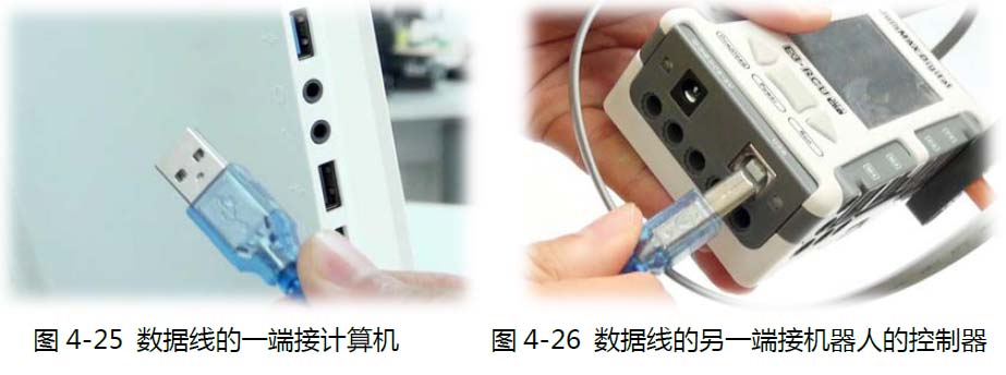 下一步我们要把程序下载到机器人中。机器人配件箱中带有一条数据线(参见图4-23)。