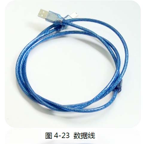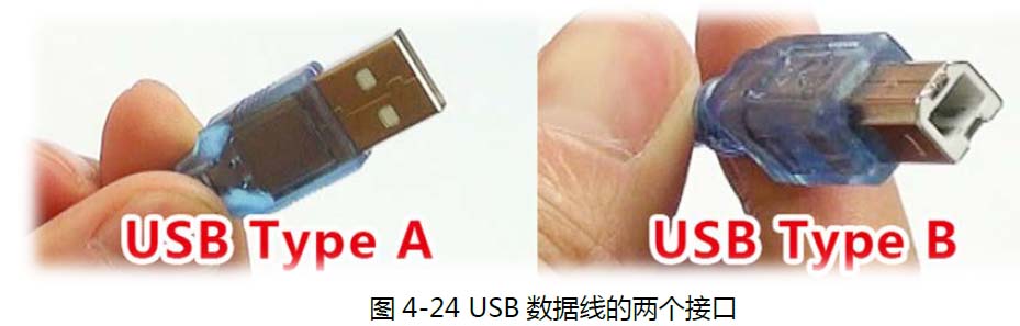 数据线有两个接口,一个像是U 盘的接口,称为:USB Type A 接口;一个是方型口,称为:USB Type B 接口(参见图4-24)。