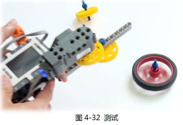 我们来测试一下(参见图4-32),把陀螺装在发射器上,按下触碰传感器,电机(马达)开始旋转,抬起发射器,陀螺飞速旋转,成功!