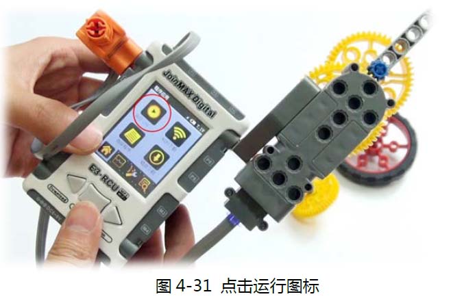 在“程序应用”菜单(也就是打开之后的首页)上,找到左上角的“运行”图标(参见图4-31)。按下,此时机器人就运行了。