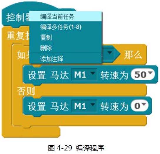然后,在“控制器”指令上单击右键,选择“编译当前任务”,开始编译(参见图4-29)。这一步和用Scratch 编游戏非常不同,下载到机器人中的程序是经过编译的程序。