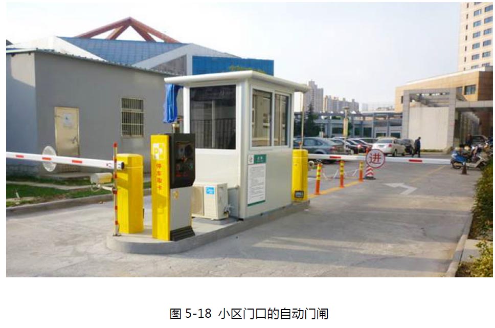 在小区门口的自动路闸一般是两个(一进一出),而且不是用按钮来升降,而是感应式的(参见图5-18)。你是否可以使用其它传感器设计一个更加逼真的自动路闸呢?(只用一个控制器,控制两个感应式的路闸)