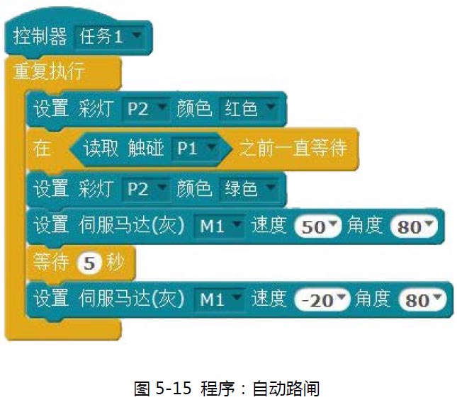 好,测试一下(参见图5-16),按下触碰传感器之前,彩灯是红色,门闸处于降下的状态。