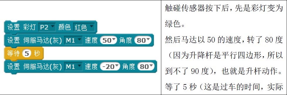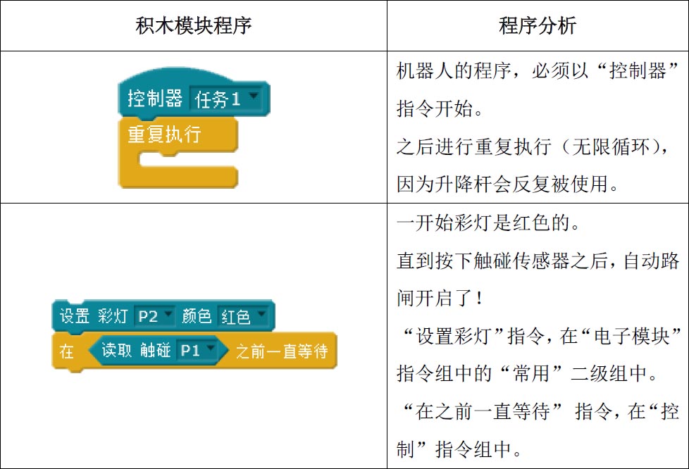上面已经介绍了机器人的工作过程,简单说就是:按下按钮,升降杆抬起,5 秒钟后,升降杆落下。升降杆落下后彩灯显示红色,抬起时显示绿色。这就是编程序的依据,也就是程序的任务描述。