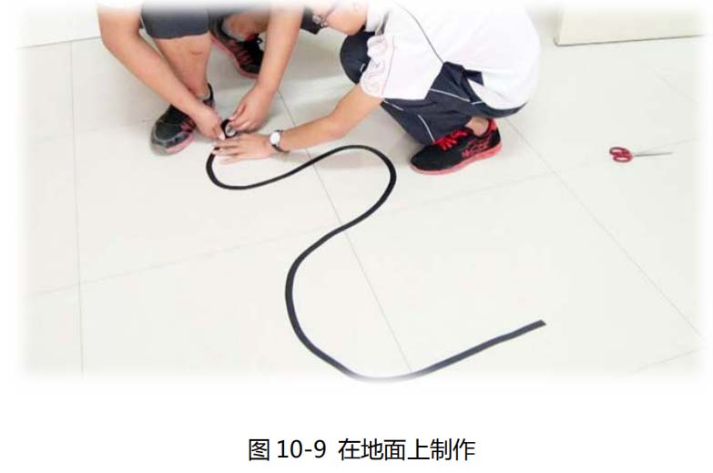 只有小车不行,还得有黑迹。同学们可以自己制作黑迹,也就是循迹小车在移动时下面的“轨道”。