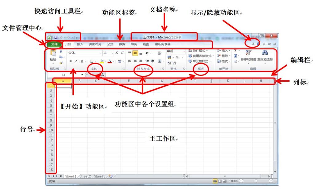 启动Excel的方法与Windows 7环境下的其他应用软件相同。当启动后,屏幕上就会出现工作界面,图5-0-1所示的是Excel 2010的界面。该界面与Windows系统的其他应用程序的工作界面很相似。它的工作区看上去就像是一张空白的表格以备填写,被称为工作表。底部有三个标签,当前系统默认的工作表是Sheet1,此时,Sheet1是活动工作表,即正在使用的工作表。多个工作表组成工作簿。