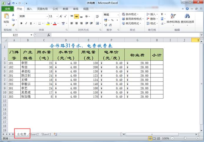 (1)打开“水电费”工作簿,单击“Sheet2”工作表标签,选中该工作表。