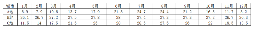 1.表5-4-3分别给出了三座城市的月平均气温。请你利用函数计算出三座城市的年平均气温,以及每个城市的最高月平均气温、最低月平均气温。
