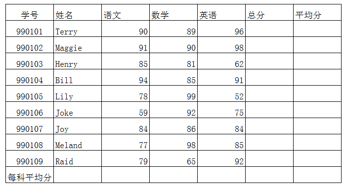 2.表5-4-4给出了部分同学的期末考试成绩,请分别计算出他们的总分平均分以及每科的平均分,并对表格进行适当的格式化。