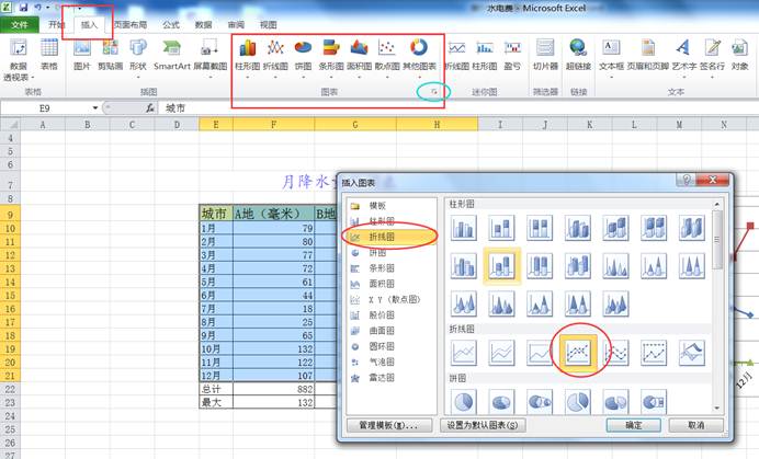 2)在【插入】功能区“图表”设置组中,点击右下角的“对话框启动器”按钮从弹出的对话框的左侧列表中选择“折线图”,然后从右侧列表中选择子图表类型(本例中选择的是“带数据标记的折线图”),点击“确定”,如图5-5-1所示。