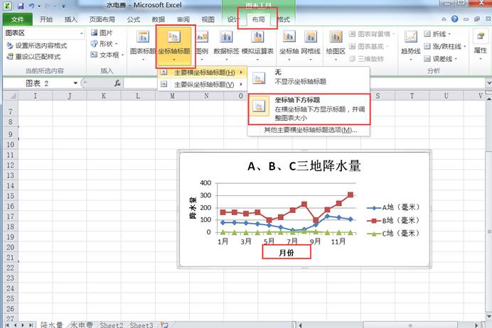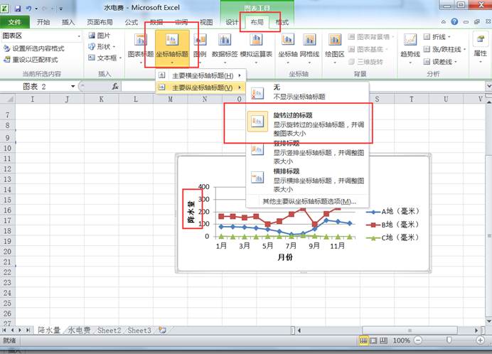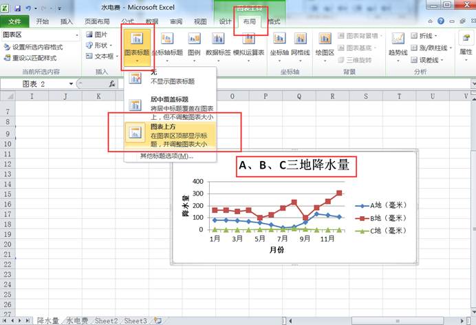 在【布局】功能区的“标签”设置组中,点击“图表标题”下的小三角选择“图表上方”选项,输入“ABC三地降水量”,完成图表标题的设置,如图5-5-2