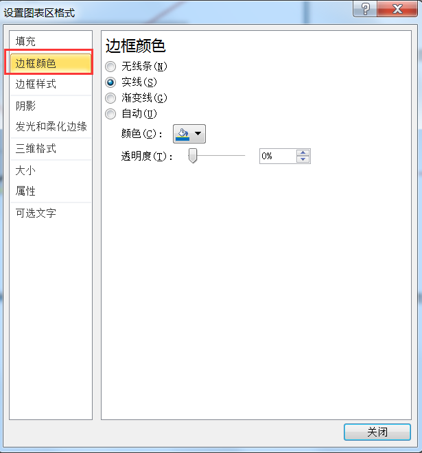 鼠标双击图表区打开如图5-5-6所示的“设置图表区格式”对话框。在“边框颜色”选项卡中,选择“实线”,“颜色”选择为“蓝色”,设置边框颜色。