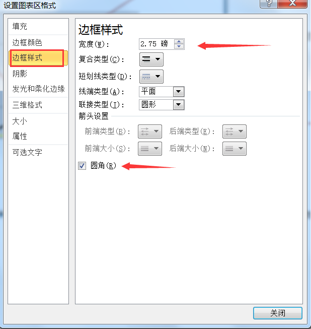 在“边框样式”选项卡中选择宽度2.75磅,选中“圆角"复选框,如图5-5-7设置边框样式。