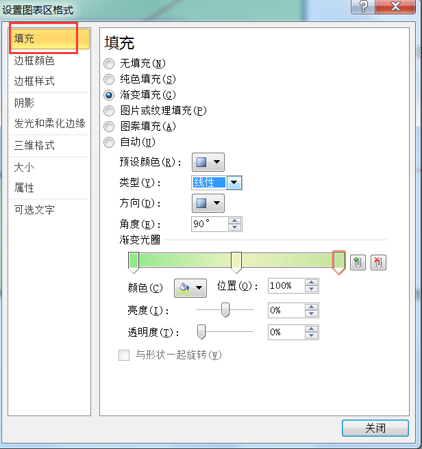 在“填充”选项卡中设置为由浅绿到浅黄的渐变效果(渐变效果的设置方法与Word相似),如图5-5-8设置填充效果。