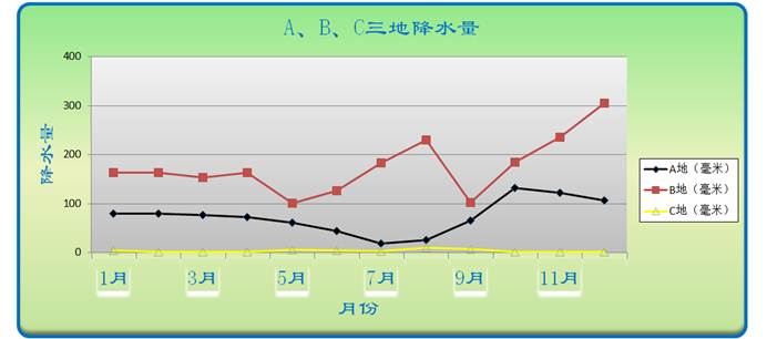 根据降水量变化折线图可以看出,A10月降水量最大,B12月降水量最大,C8月降水量最大。从图中还可以看出,B地全年降水都比较丰富、降水量最大;C地全年降水都比较少,属干旱地带。