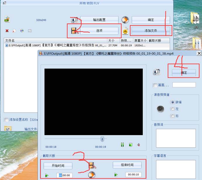 操作指南:“格式工厂”截取视频片段步骤如下图6-3-3所示(以视频转成FLV格式为例):