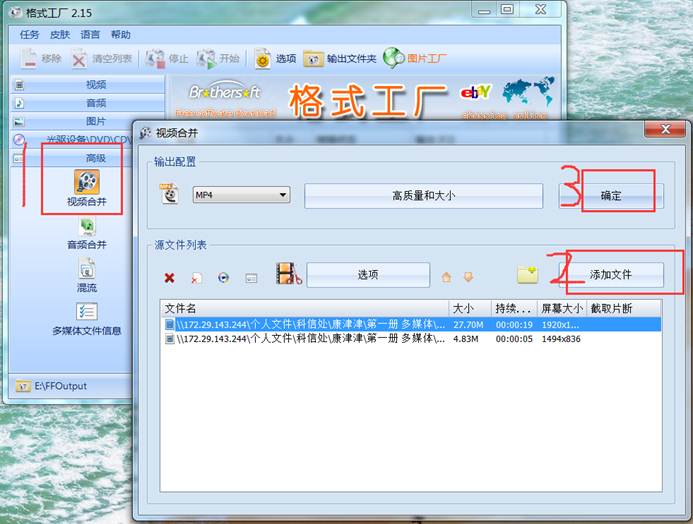 操作指南:“格式工厂”视频合并片段步骤如下图6-3-4所示:
