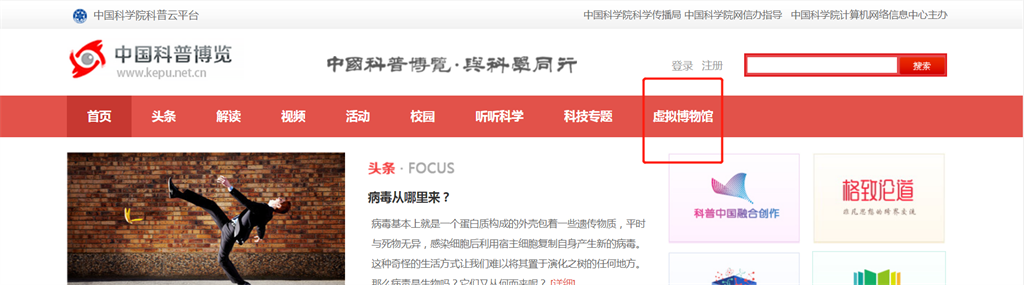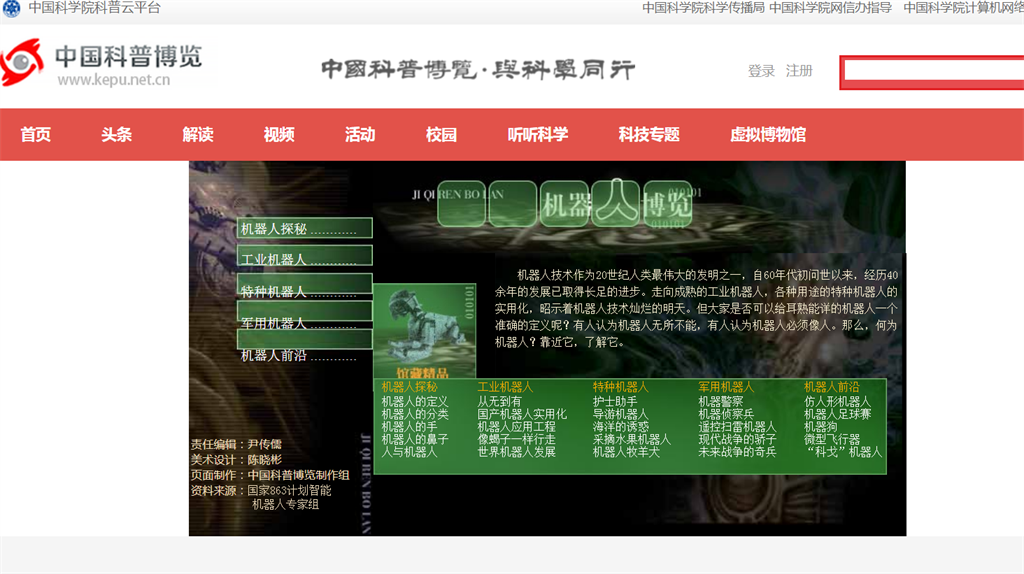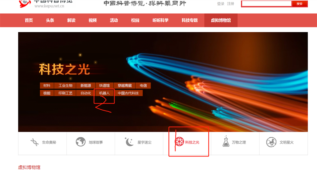 3.进入网站后,点击导航框中的“虚拟博物馆”,如图7-2-2所示,进入虚拟博物馆之后,点击“科技之光”栏目一项中的“机器人”栏目上,如图7-2- 3所示。