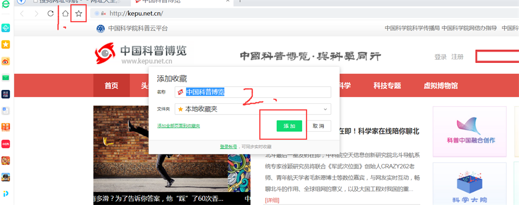 6.执行如下操作,将该地址添加到收藏夹中,如图7-2-5所示。下次访问的时可以直接点在收藏夹中链接。
