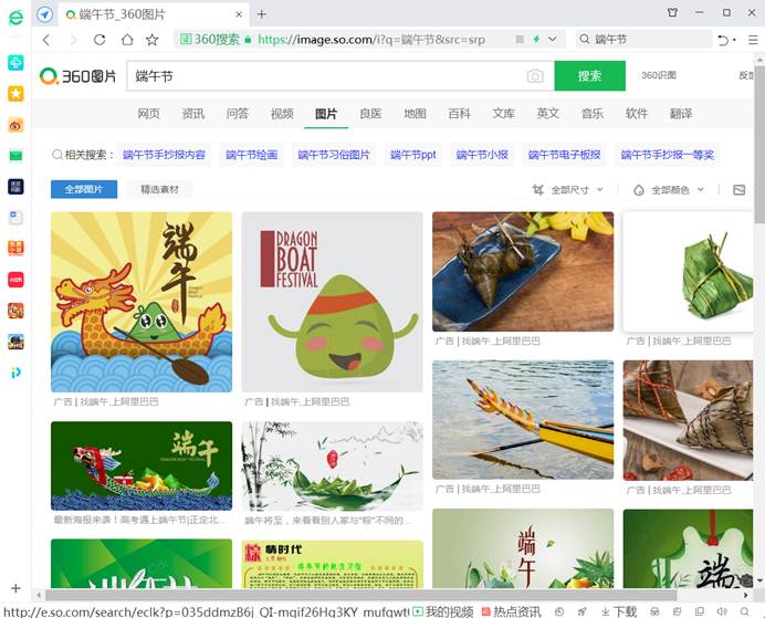 在查询框上还有十余种不同类型的链接,它可以帮助我们搜索指定类型的信息。例如,选择单击“图片”链接,查询“端午节”时,搜索到所有图片标题含有“端午节”的图片,如图7-3-7所示。