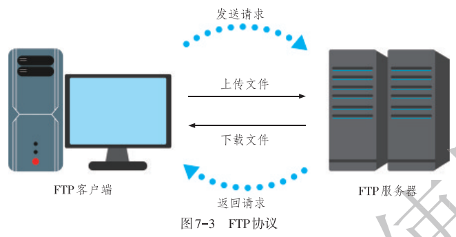 FTP(File Transfer Protocol)文件传输协议,它可以让用户在两个联网的计算机之间传输文件(如图7-3)。用户将一个文件从自己的计算机发送到 FTP服务器上,称为FTP的上传(Upload);用户从服务器上把文件或资源传送到自己的计算机上,称为FTP的下载(Download)。