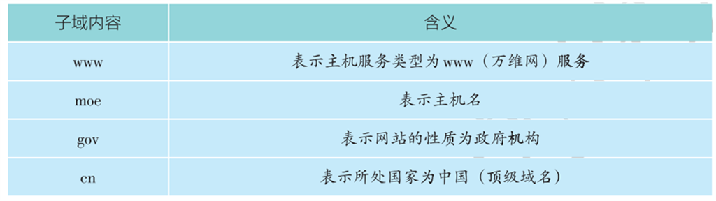 IP地址是一串数字,不易记忆,因此定义了一种字符型的主机命名方式一-域名(DomainName)。域名是互联网上用于标识和定位网站一串字符。域名采用层级结构,由2部分组成,各部分之间用圆点“.”隔开。一个完整的域名最右边的是顶级域名,一般表示网站的机构性质或所处的国家或地区。通过域名地址,可以看出网站的主机服务类型等信息。www.moe.gov.cn的含义如表9-2所示。