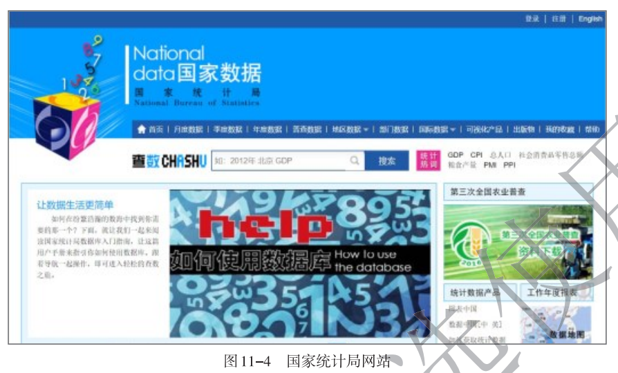 从专业网站或官方平台进行搜索,有助于获取更专业的内容和更权威的数据。如访问12306网站查询高铁车次,访问政府官方平台搜索权威数据或信息。政府官方平台的导航目录通常结构清晰,可以快速找到需要的信息,也可以利用网站自带的搜索引擎查找相关资源。如图11-4所示的国家统计局网站涵盖了社会各层面的宏观数据,包括人口、产值、贸易等统计数据。