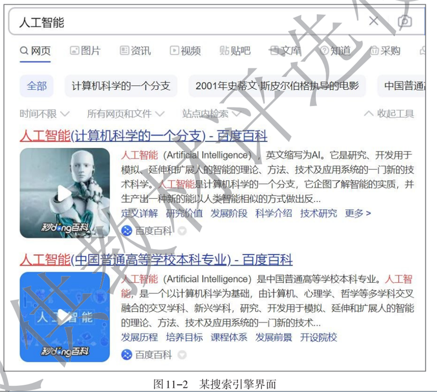 打开搜索引擎,输入关键词即可搜索到相关的信息。例如,在搜索引擎中输入关键词“人工智能”,可以搜索到大量有关“人工智能”的信息(如图11-2)。