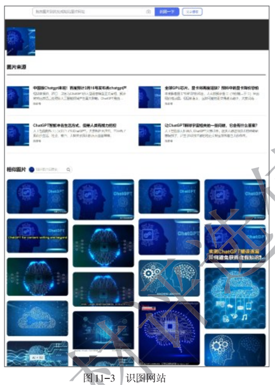 若要查找图片,可以在搜索引擎中选择“图片”类型,输入关键词,即可搜索到互联网中的相关图片资源;也可以通过识图网站上传图片,从互联网中搜索与这张图片相似的图片资源(如图11-3)。通常购物网站或平台也有以图搜商品的功能。