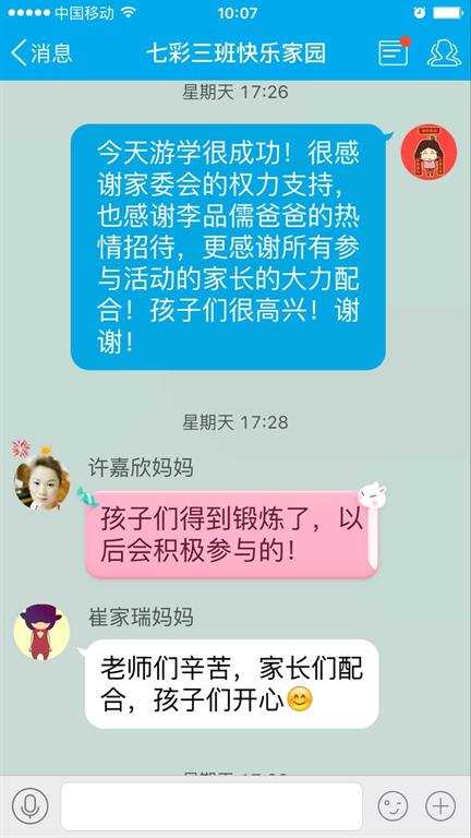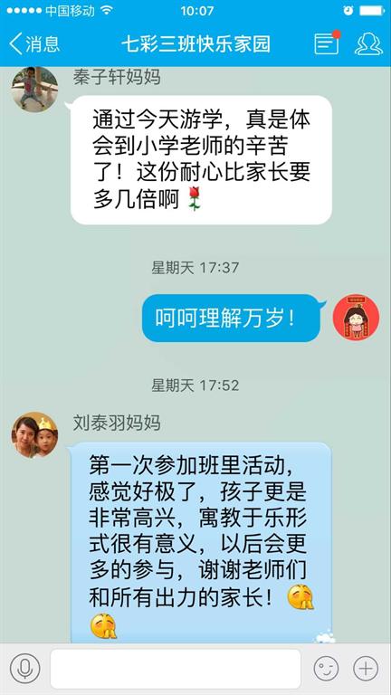 我们一年级三班举行了一学期一次的班级游学活动,孩子们都很高兴。兴高采烈的参与到活动中,家长们也是很高兴,在微信朋友圈里是各种晒自己的宝贝。虽然很累但是看到孩子们的开心的笑脸,群里家长朋友们的理解、支持和赞赏,我觉得自己的辛苦很值得!