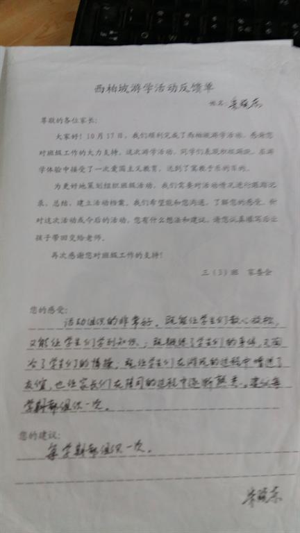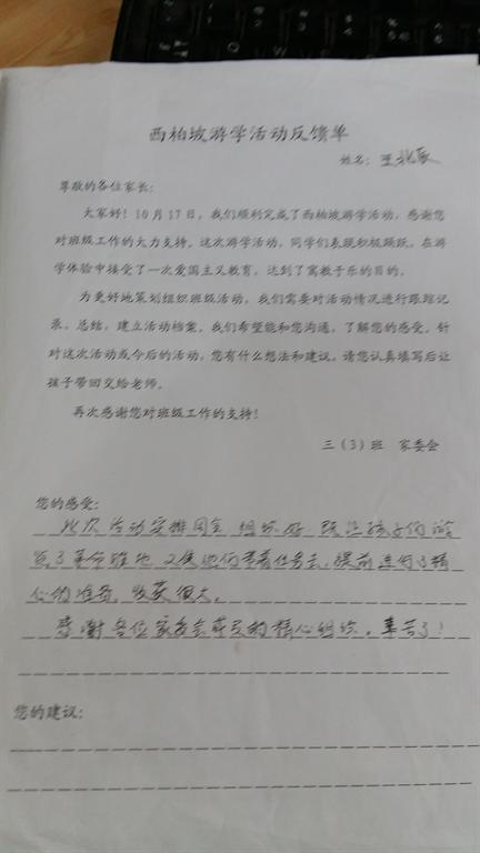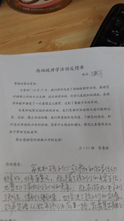 周日随全班同行,车上的热闹气氛感染着每个家长,小九的精彩主持,赵誉霖的二小放牛郎,一个个有趣的脑筋急转弯,笑声一路。这让我渐渐感觉到,去学习历史知识,体会重大意义是次要的。到达西柏坡,孩子们把自己精心准备的故事认真得讲给大家,没有准备的孩子专心听讲,回答问题。我发现其实这才是最好的革命历史启蒙教育。回到家,杨博舒认真找出照片,准备电子报,我才知道,之前班里组织看了西柏坡动画片,孩子们都十分喜欢,杨博舒特意照了那只钢笔的照片,告诉我“原来真的有那只钢笔!”呵呵,是否真是那只笔真的不重要,重要的是孩子们为这次游学做了充足的准备,在这个过程中,孩子们学到了超出历史知识以外的更多东西,先前我的想法真是肤浅了,感谢学校和老师们的精心安排!感谢我们的家委会!