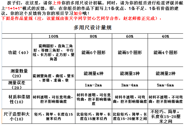 第二,校网的应用。学生将自己多用尺的初步设计上传到校网我的初步设计中,我组织大家进行组内“1+1+1”评论.