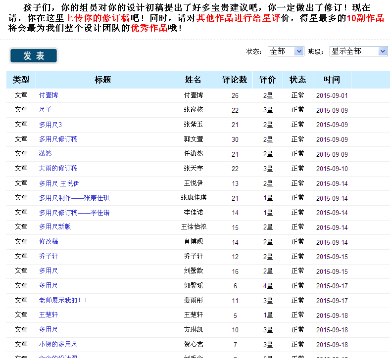 学生再修改自己的作品,将”修订稿”上传到校网”我的修订稿”中。我组织大家进行全班给星评价并给出原因,选出10副优秀作品继续进行接下来的项目。