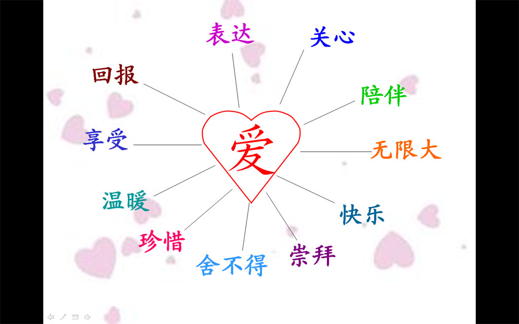 第二课时原本的设计是学生自主阅读故事《猜猜我有多爱你》或《我的爸爸叫焦尼》,体会文中的爱,最后学习表达爱。但是由于时间的原因,而且因为没有电脑,不能图文并茂,对于识字量较弱的孩子,困难较大。所以临时改变策略。我带领孩子们一起来感悟这两个故事。在一起阅读的过程中,我们又重新解答了单元开题时的问题:爱是什么?在整个课堂中,孩子们随着情景的变化、语气的变化,感受着爱的传递,总是能在细微之处发现爱。我们的“爱”之树不断的开枝散叶: