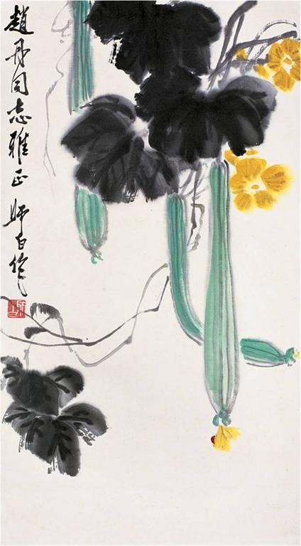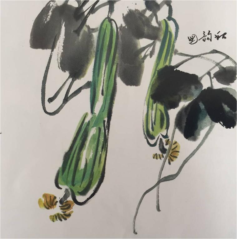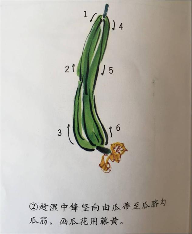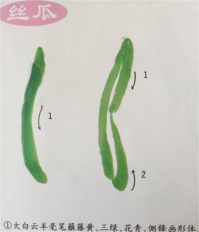 1、画丝瓜:一般为淡绿,花青、藤黄、三绿(藤黄一定要少),用中锋2-3笔画出一条丝瓜,注意形状,在半干时画筋脉。