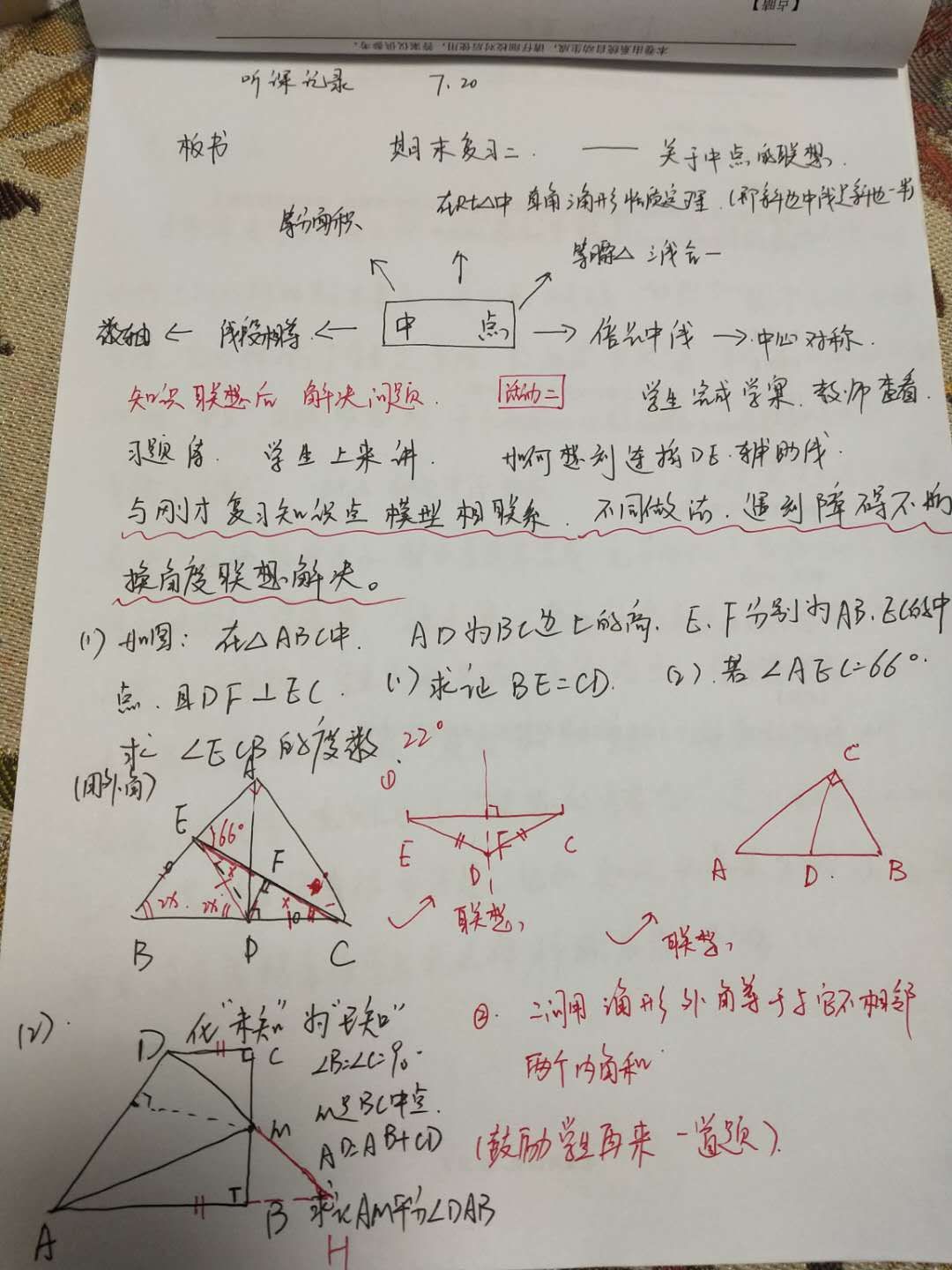 知识点对应习题两道: | 小组讨论,教师转班查看学生总结出关于中点的四个内容,比如平分线段;等腰三角形中线的“三线合一”;中心对称式全等;直角三角形斜边中线是斜边的一半。之后老师让学生来补充不足和点评后再展示自己归纳的知识点。学生通过讨论,补充,点评,总结能够准备把握基础知识。更全面系统的梳理“中点”在几何中的意义。 这两道题都需要做出辅助线来完成,鼓励学生尝试完成,让学生完成后上来讲,有学生有疑问时放慢速度,及时提问并要求同学上来补充。 学生讲完后教师对应前面知识点的基础模型进行对比。完成后学生点评优缺点,真正做到了学生是主体,教师是组织者。 |